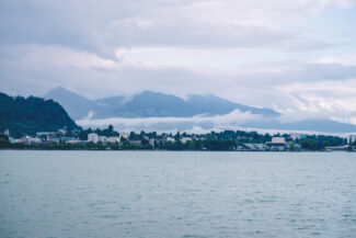An einen Campingplatz, ganz in der Nähe, begann dann unsere Tour offiziell. Nach kurzer Zeit, bemerkte ich am Rand, aus dem Augenwinkel und mehr oder weniger zufällig, eine steinerne Stehle. Prompt waren wir damit bereits in Österreich und fuhren entlang des Bodensee in Richtung Bregenz. Vorbei am Bahnhof, an den ich mich auf der Rückfahrt vom Teil 1 unserer Alpenüberquerung noch sehr gut erinnern konnte und weiter an der bekannten Seebühne vorbei, ehe wir über einen Steg die beeindruckende Bregenzer Ach überquerten.