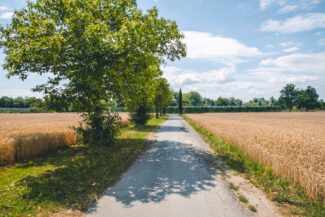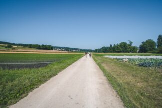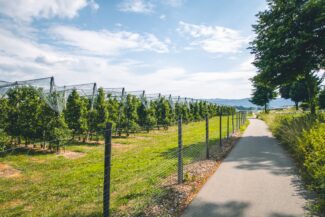 Ab Liggeringen ging es wieder für uns bergab, bis wir nach rund 31km die Ortschaft Stahringen erreichten. Ab hier änderte sich auch die Landschaft deutlich: Unheimlich viele Obstplantagen prägten nun das Bild am Radweg- egal wohin man sah- überall waren große Plantagen angelegt, die mit Sonnenschutz überdacht waren.