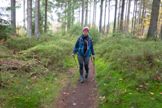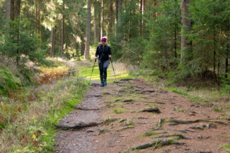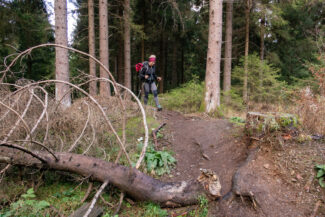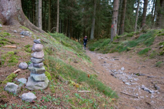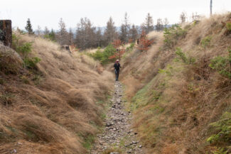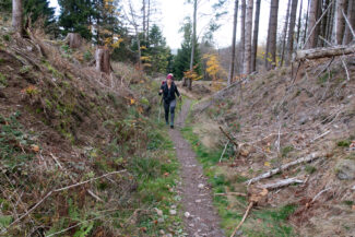 Auf einen kurzen Abschnitt, nach rund 15 Kilometern, ging es wieder einmal hochwärts. Hier befindet sich der Rennsteig in einer Vertiefung, die das Regenwasser immer mehr auswäscht. Dadurch hat man nicht mehr den feinen Boden, sondern wieder den groben Schotter, der das Laufen nicht angenehm macht. Bergauf und auf einen solchen Untergrund- zwei Dinge, die Christin wahrlich nicht brauchte.
