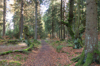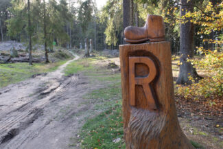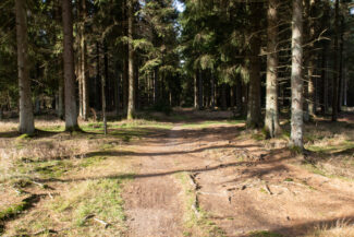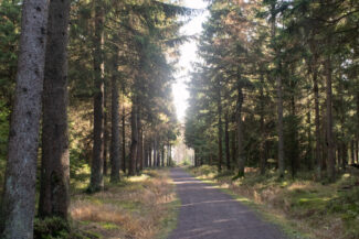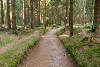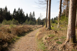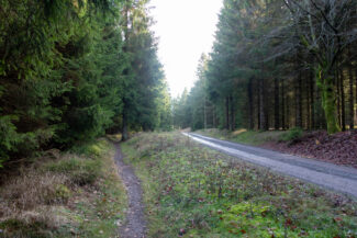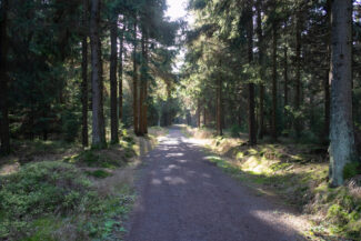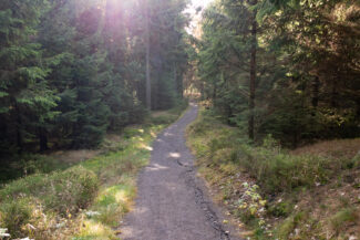 Nach diesen Rastplatz kamen wir durch ein Stück, was für mich optisch genau das war, wie ich mir den Rennsteig vorgestellt habe: Nadelwald, lichtdurchflutet, ein gut angelegter Weg…ach, diese Beschreibung trifft jetzt gerade auf so viele Abschnitte dieser Tour zu, aber vermutlich hat es mir der Anblick diesen Weges angetan, der ein wenig vertieft durch den Wald verlief. Man hat da Gefühl, als käme gleich das Pferdefuhrwerk von Händlern entgegen, die früher den Rennsteig nutzten.