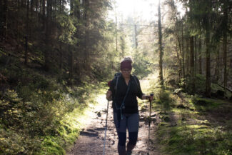 Nach rund 22 Kilometern Gehstrecke erreichten wir die kleine Saalhütte, die mitten im Wald lag. Leider stimmen die Bilder von Google Map nicht mehr, da auch hier der umliegende Wald enorm viel Baumbestand verloren hat. Hier hielten wir kurz an, nahmen unser Motivationsschluck aus dem Flachmann (also nur ich, siehe Christins Ibuprofen) und stärkten uns ein wenig.