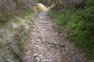 Zwar galt es diesmal nur ca. 70 Höhenmeter auf einen Kilometer Länge zu überwinden, aber es musste ausgerechnet nochmal ein solches Wegebett sein, auf der regelmäßig das Regenwasser herunterläuft und nur grobes Gestein liegen lässt.
