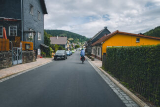 Wir hatten uns also, nach den anstrengenden und fast dauerhaften Anstieg bis zum Rennsteig, gut warm gefahren und konnten an der kleinen Wanderhütte starten. Verlief der Weg bis hierher über eine Landstraße, so ging es nun über über kleinere und glücklicherweise kaum befahrene Ortsverbindungsstraßen bergab. Es ging durch Wälder und kleinere Ortschaften- immer den kleinen Bach neben uns, der sich bald mit einen weiteren zu der Ilm zusammenschloss.