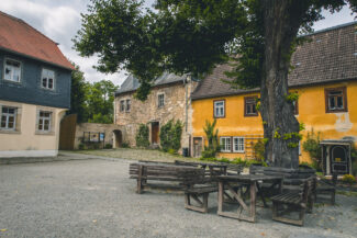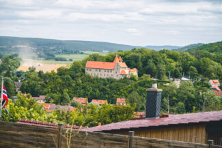 Ungefähr bei Kilometer 65, kamen wir in Kranichfeld an. Die kleine Stadt, die nicht als Kleinstadt, sondern als Landstadt eingestuft ist, befindet sich gerade einmal 5 Autominuten vom Naherholungsgebiet Stausee Hohenfelden entfernt. Ebenso ist Kranichfeld für seine 2 Burgen/Schlösser bekannt. Und eine von den beiden wollten wir uns ansehen und dort auch unsere nächste Pause einlegen.