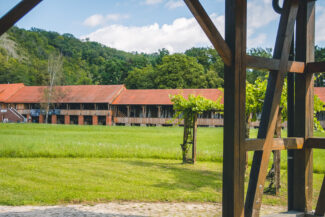 Nach kurzen Zwischenstopp an der Mühle, dauerte es keine halbe Stunde, ehe wir Bad Sulza erreichten. Vorbei an den Kurkliniken und am Kurpark entlang, kamen wir bei Kilometer 36 am Thüringer Weintor an, das in der Nähe des Gradierwerkes steht. Hier starteten wir auch schon mal zu einer kleinen Wanderung durch die Weinberge.