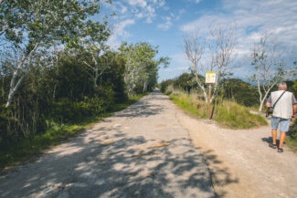 Natürlich gab es entlang dieser Geraden auch wieder verschiedene Beobachtungsstellen und Aussichtstürme, bis ein Schild an der ersten Kreuzung darauf hindeutete, dass es links zur Besucherinfo und rechts zum Parkplatz geht.