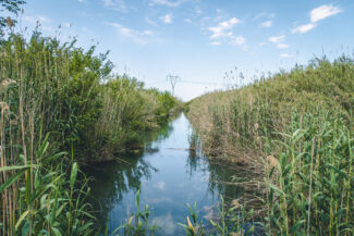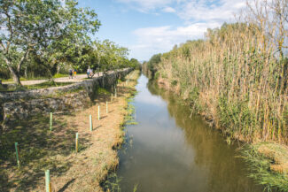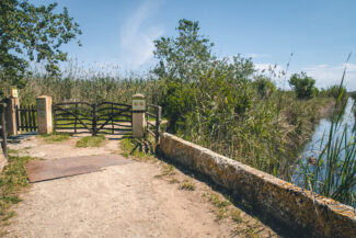 Mittlerweile merkte man die Sonne recht deutlich, auch wenn an dem Tag zum Glück ein paar Wolken für ein wenig Schatten sorgten. Auf den, über 4km langen und fast schnurgeraden Weg, kommt man an ein paar Stauanlagen vorbei, mit deren Hilfe der Wasserfluss in den Kanälen und somit auch die Feuchtigkeit im gesamten Gebiet geregelt werden konnte. Aufgrund des Alters, gehe ich davon aus, dass diese Anlagen noch aus der Zeit der wirtschaftlichen Nutzung des Gebiets stammen.