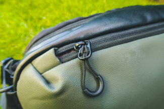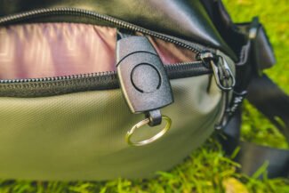 Am oberen Bereich der Vorderseite befindet sich ein Reißverschluss, der ein Fach verschließt. Darin befindet sich ein weiterer Reißverschluss, der eine Art Wertfach verschließt. Dort ist auch direkt ein Keyring und drei Fächer mit Klettverschluss. Auf der Unterseite befinden sich zwei Schlaufen, an denen ihr ein kleines Stativ oder zum Beispiel wie ich, den 3-Meter Selfie Stick der Insta 360 X3 verstauen könnt. An den Seiten befinden sich Schlaufen, die dafür sorgen, dass die Tasche im „Hüftmodus“ ordentlich anliegt. Daran sind dann auch der variabel einstellbare Trageriemen befestigt. Auf der Rückseite gelangt man ebenfalls in ein kleines Staufach mit Reißverschluss. Etwas darüber befindet sich ein Tragegriff, welcher sehr ordentlich eingearbeitet ist.