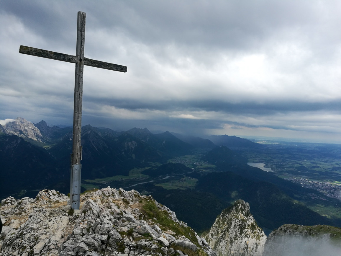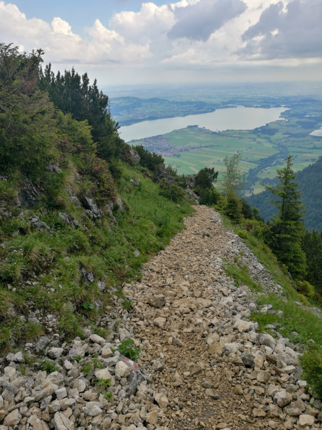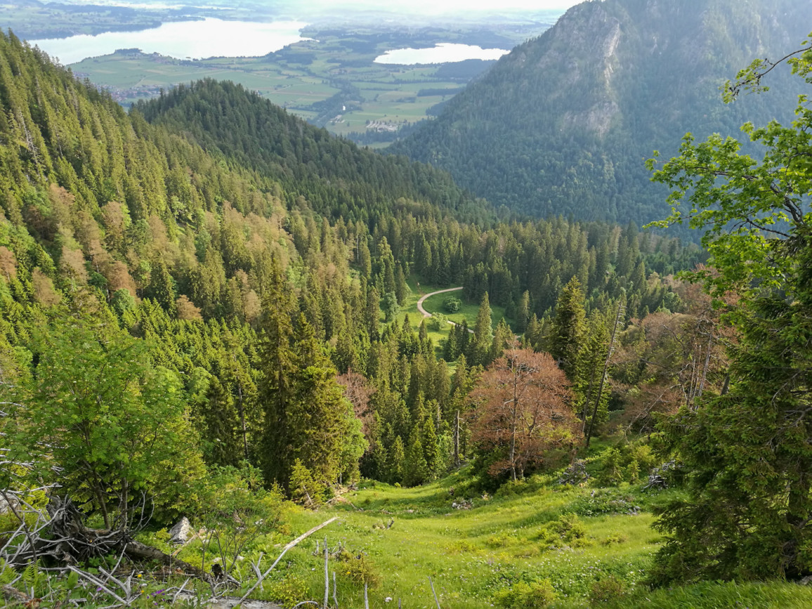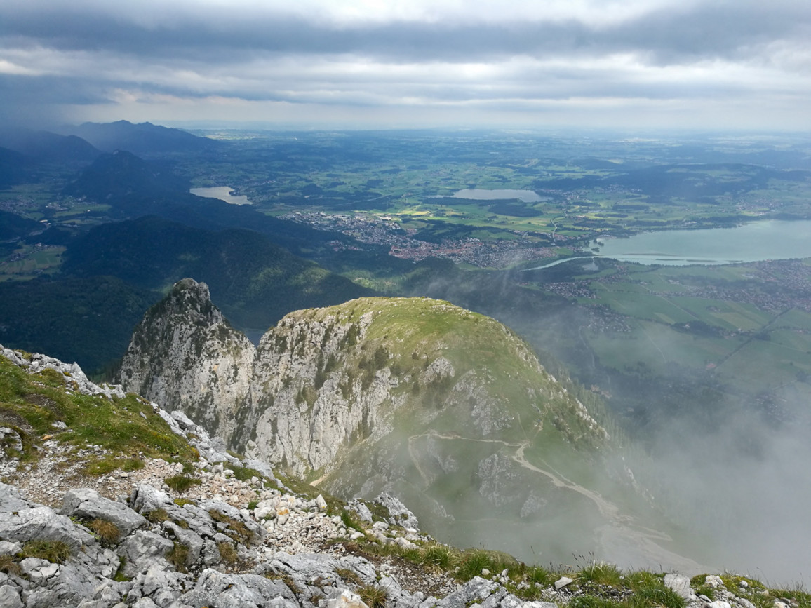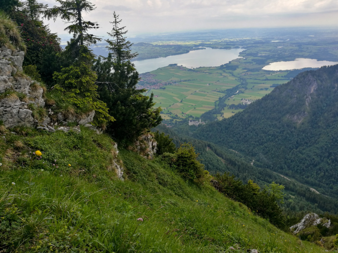 Im Tal, auf deutscher Seite, befindet sich Füssen mit seinen bekannten Schloss Neuschwanstein, dass man beim Aufstieg häufig sieht.