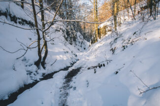 Die hier auch ausgelegten Gitterroste, ließen den Schnee anfänglich einfach durchfallen, doch scheinbar war der Schnee der letzten Tagen doch zu viel: Der Schnee und Eis bedeckten dann doch einen Großteil dieser engen Stelle, so dass hier auch schon ein wenig Vorsicht geboten war. Unter dem Gitter hörte man den kleinen Bach, der talabwärts rauschte und diese Schlucht kälter machte, als zu Beginn dieser kleinen Wanderung.
