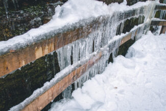 Schon bald kamen wir bei den ersten Eiszapfenflächen an, während der Weg, über Holzkontruktionen verlaufend, weiter talabwärts ging.