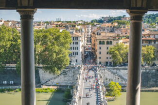 Und tatsächlich, ohne Anzustehen und wieder nur den Erwachsenen zahlend, kamen wir ohne Probleme in die Engelsburg, die zu unserer Überraschung auch nicht überlaufen war. Schon auf den unteren Ebenen hatte man einen tollen Ausblick auf die Stadt, aber die Aussicht auf der Engelsterrasse übertraf diese noch bei weitem. Ein Traum mit direkten Blick auf den Petersdom. Dafür alleine hat sich der Eintritt von 13 Euro gelohnt!