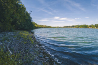 Während der nördliche Ufer breiter und mit ein wenig Abstand zum Wald ist, verläuft die Baumgrenze im Süden oftmals direkt hinter dem Ufer.